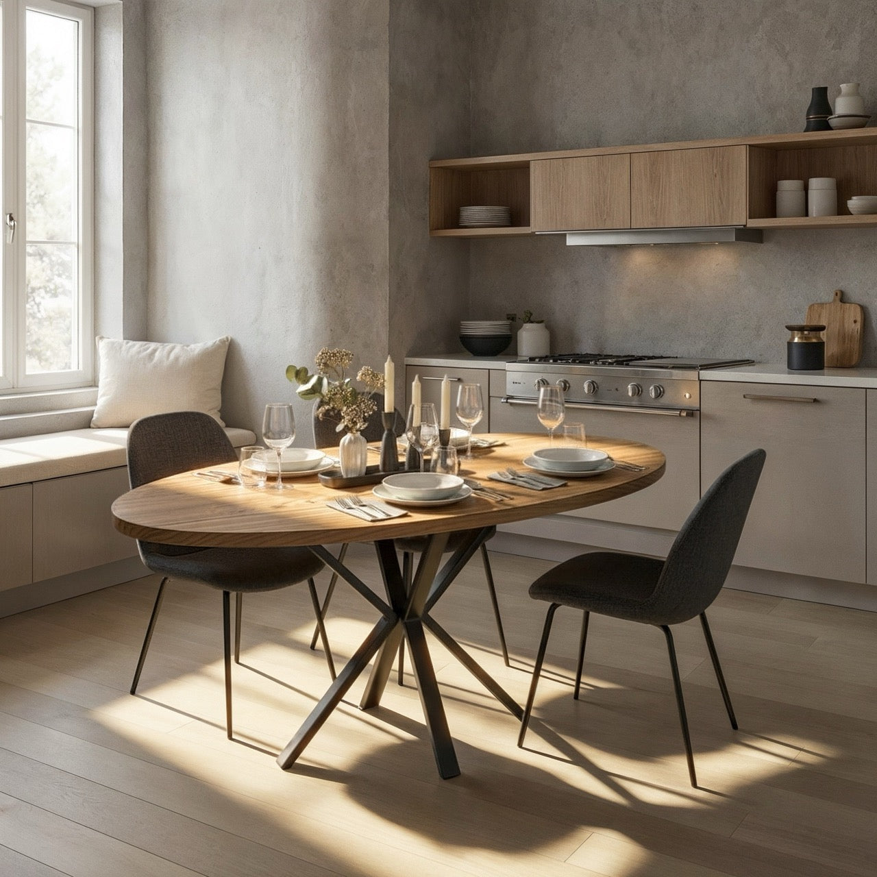 The pictured Lala Pedestal Dining Table is handcrafted from solid walnut and black powder coated iron.