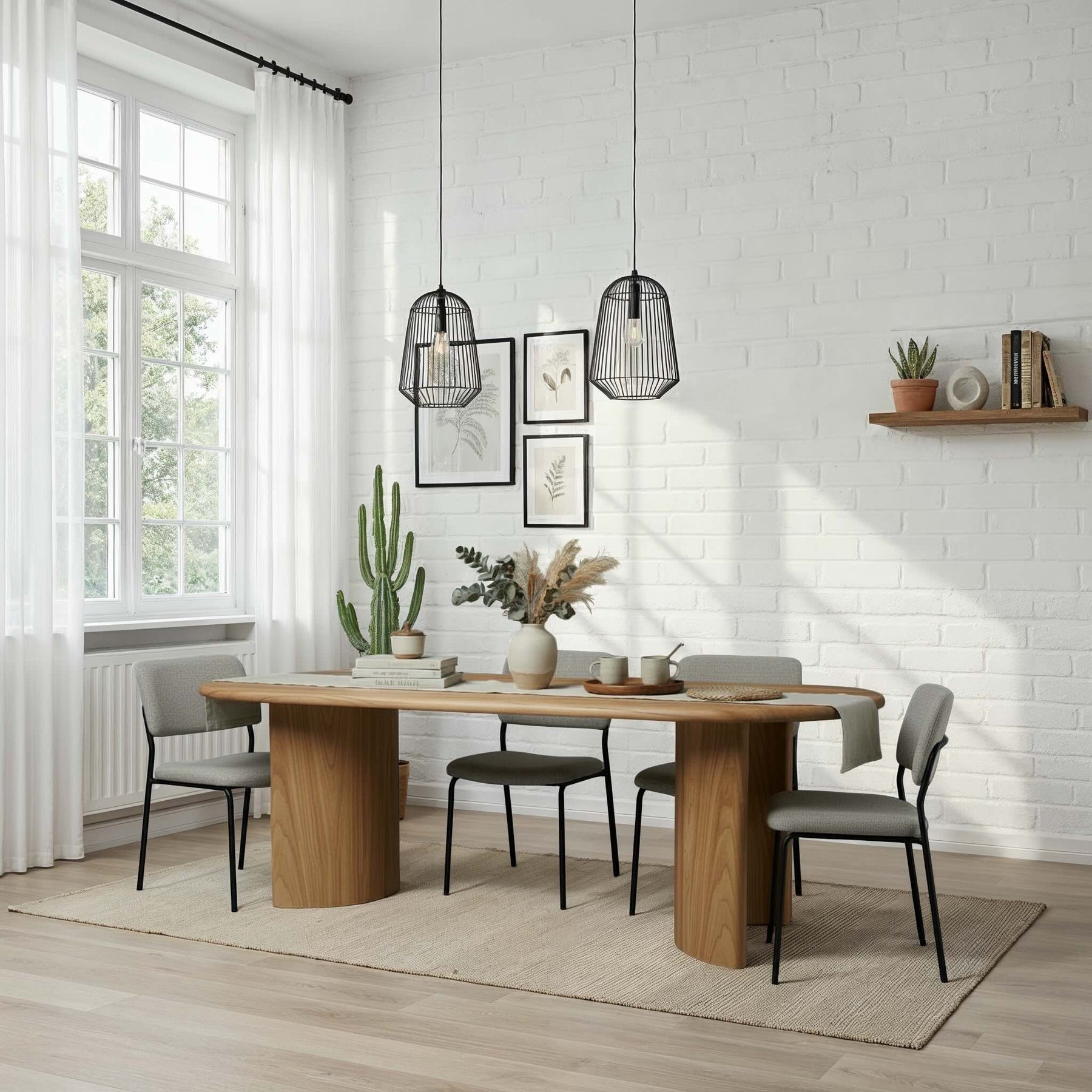 The racetrack shape accommodates dinner parties and work sessions with equal ease. The pedestal base allows chairs to slide in from any angle without hitting table legs, making seating flexible rather than predetermined. That practical consideration emerged from the form rather than being imposed on it.