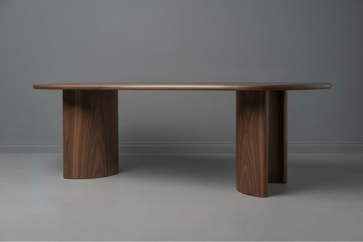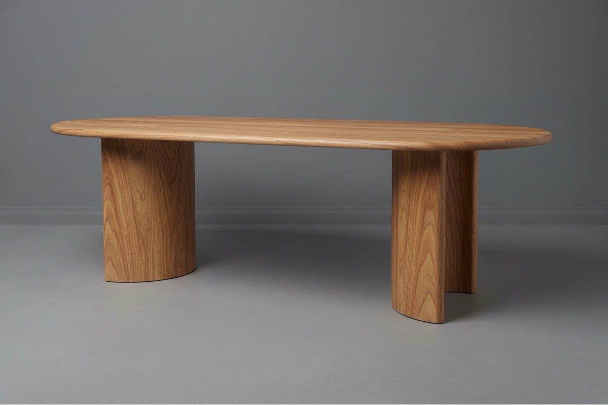 The two semi-cylindrical pedestal bases anchor the table through sculptural geometry rather than conventional legs. Those curved planes maximize legroom while creating visual rhythm that echoes the tabletop's contours. The symmetrical placement provides stability without visual clutter, keeping sightlines clean across the dining space.