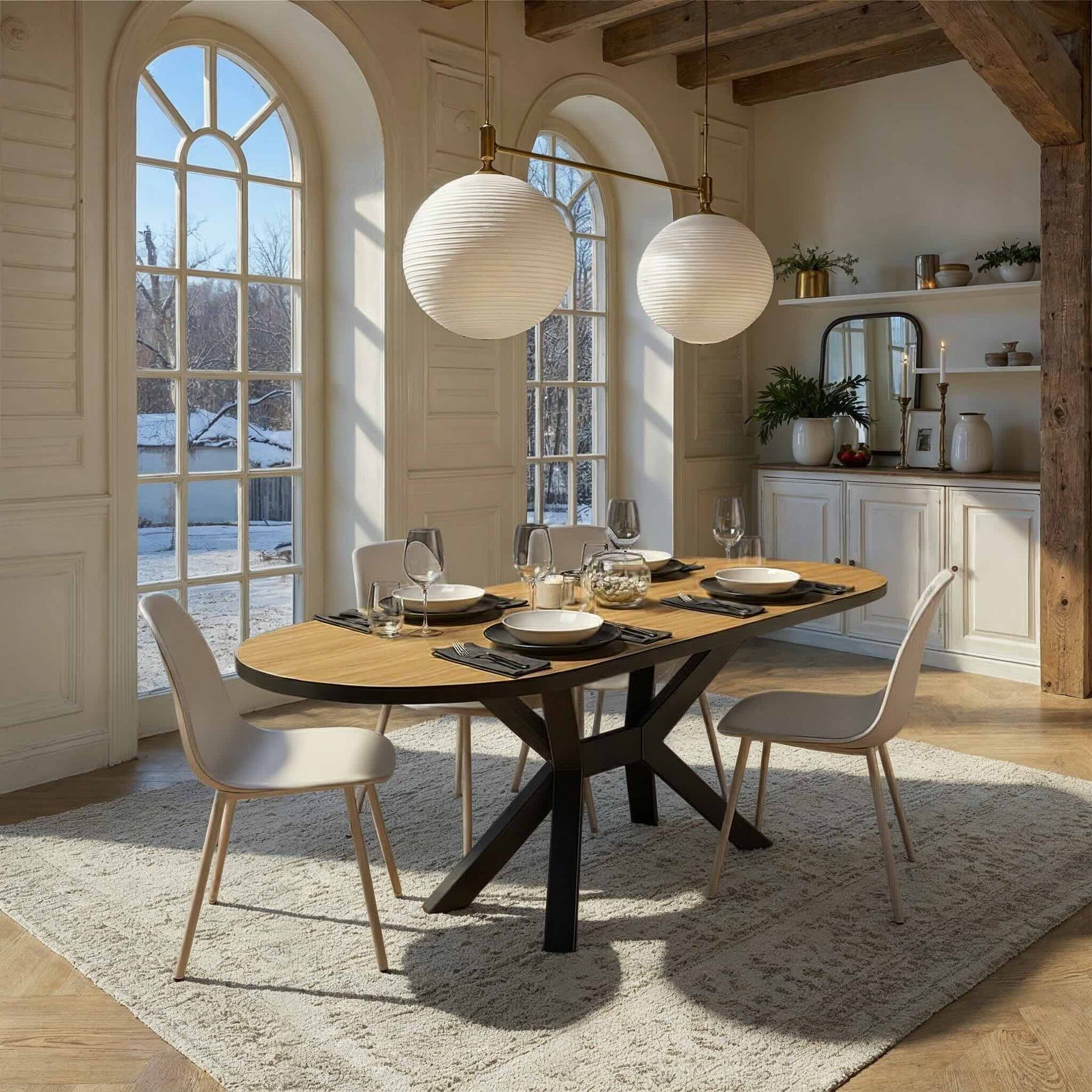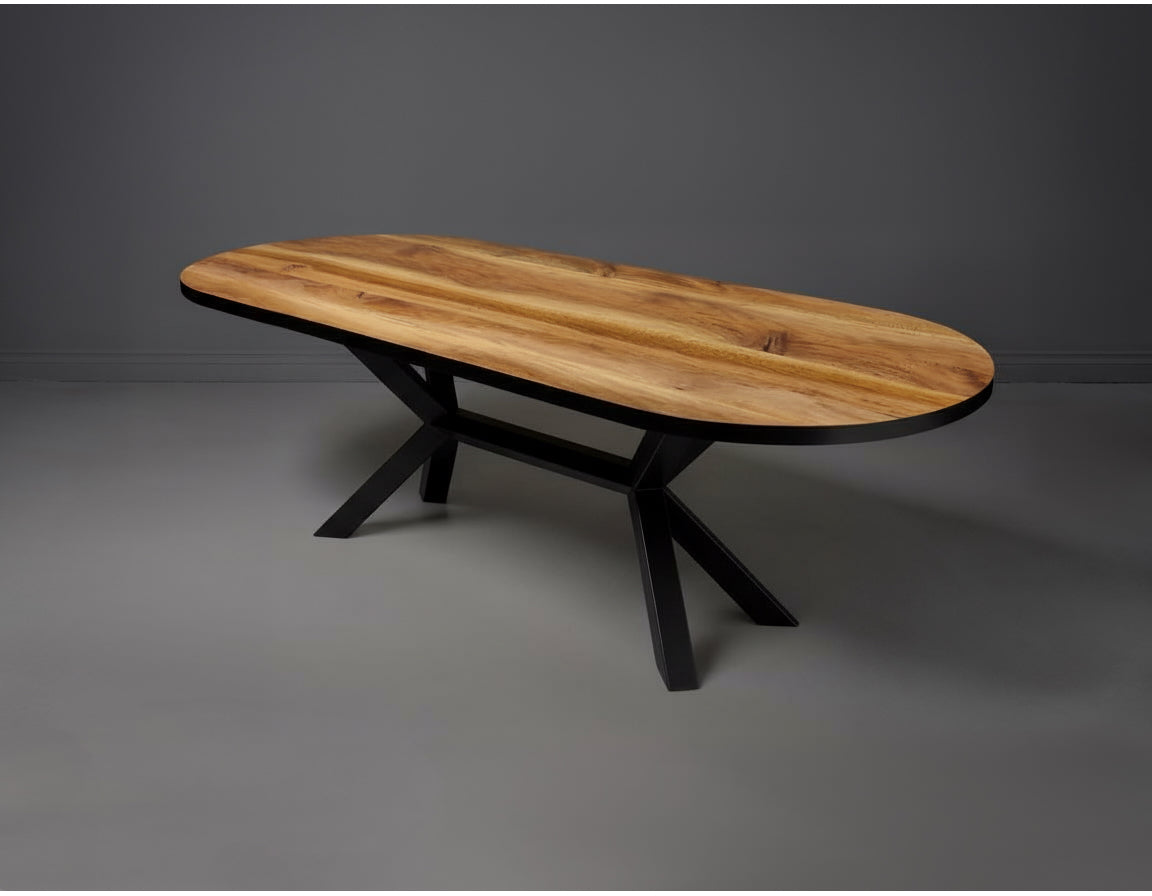 Above, a racetrack oval top in warm natural hardwood softens all that geometric edge. The elongated shape naturally draws people into conversation, eliminating the dead zones and awkward reaches that plague rectangular seating. A crisp contrasting edge band frames the organic wood surface, adding contemporary punch without overwhelming the grain patterns developed over decades of California growth.