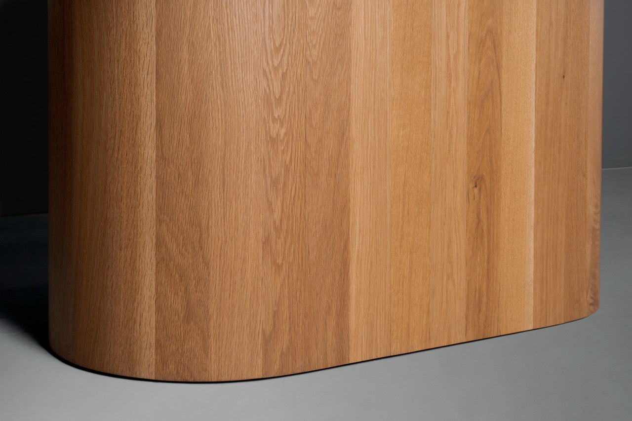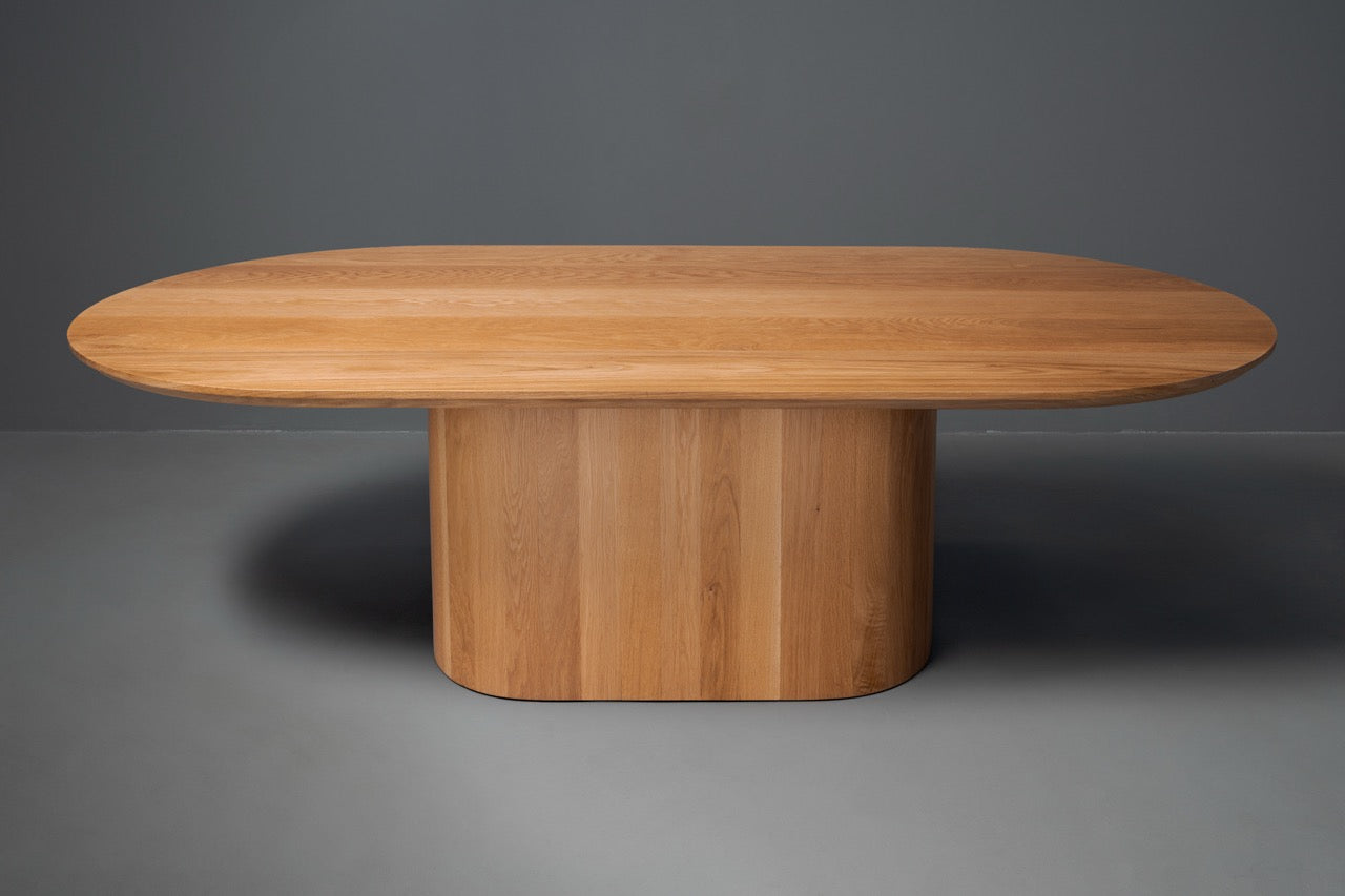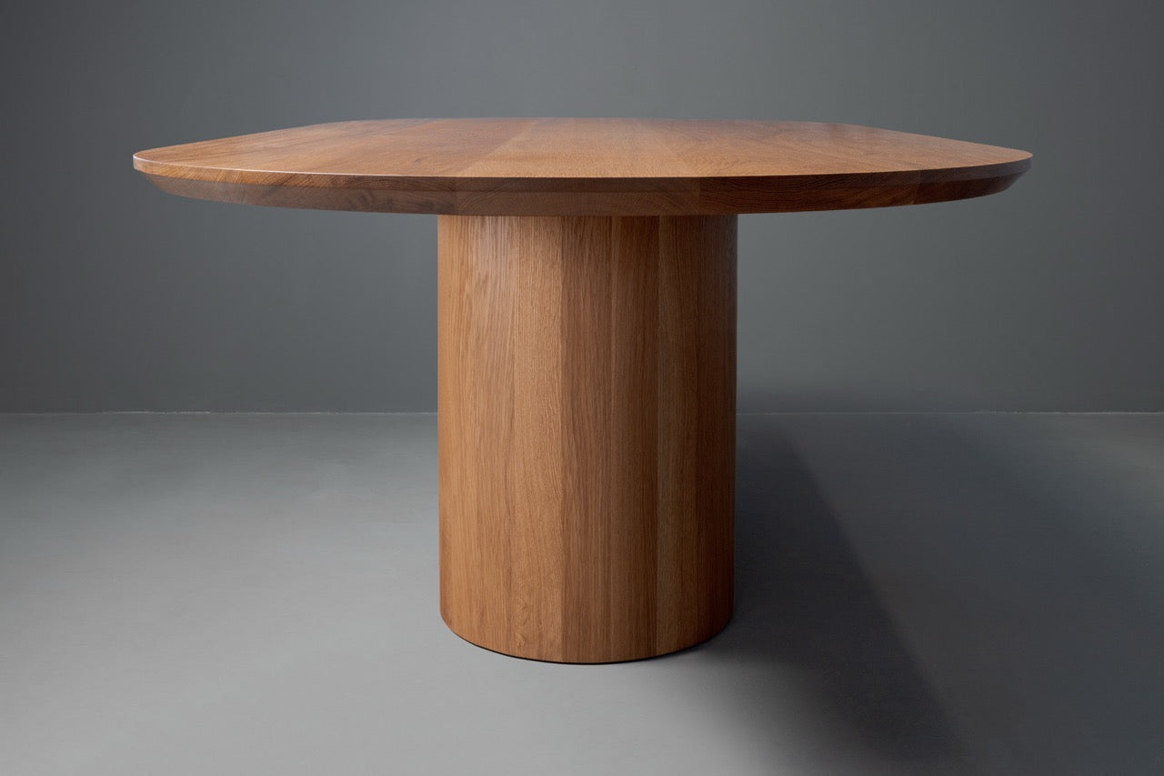 Natural beauty meets sculptural design with the Dottie.  Pictured here in naturally fallen sycamore and in white oak, the tabletop’s swirling grain sets it apart right away—no two pieces are ever the same. Down below, the solid wood base has a bold, modern silhouette that feels substantial and steady, giving the table a confident presence without overwhelming the room. It’s the kind of piece that quietly commands attention, perfect for everything from your everyday meals to the big gatherings you’ll still be talking about years from now.