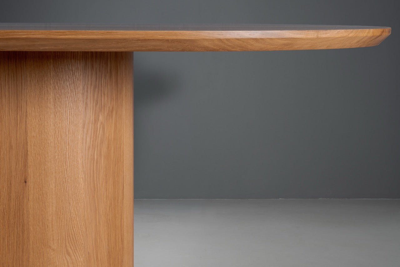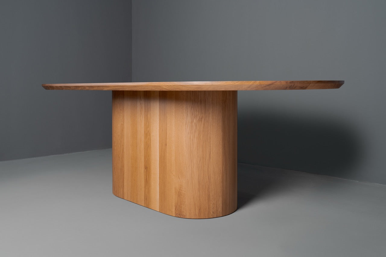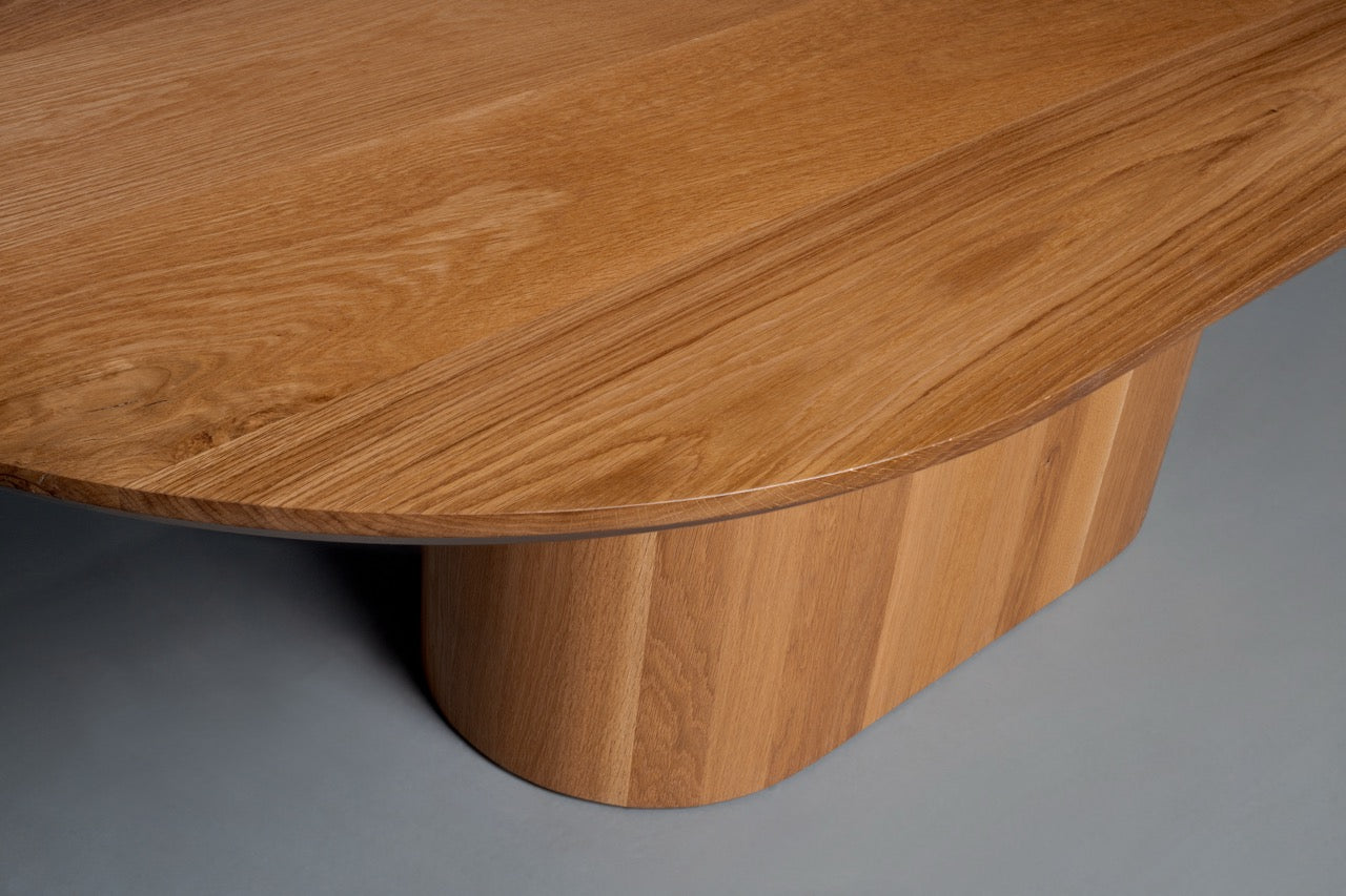 Natural beauty meets sculptural design with the Dottie.  Pictured here in naturally fallen sycamore and in white oak, the tabletop’s swirling grain sets it apart right away—no two pieces are ever the same. Down below, the solid wood base has a bold, modern silhouette that feels substantial and steady, giving the table a confident presence without overwhelming the room. It’s the kind of piece that quietly commands attention, perfect for everything from your everyday meals to the big gatherings you’ll still be talking about years from now.